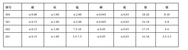 不銹鋼在冶煉過程當(dāng)中,由于加入合金元素品種不同,不同品種加入量的不同。其特性也是不同的,為了加以區(qū)別則冠上了不同的鋼號(hào),下面是常見裝飾用不銹鋼不同鋼號(hào)“合金元素”含量表僅供參考: