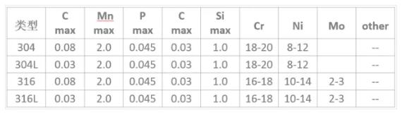 不銹鋼:耐空氣、蒸汽、水等弱腐蝕介質(zhì)或具有不銹性的鋼種。通常使用的鋼種為304、304L、316、 316L,是奧氏體不銹鋼的300系列鋼。